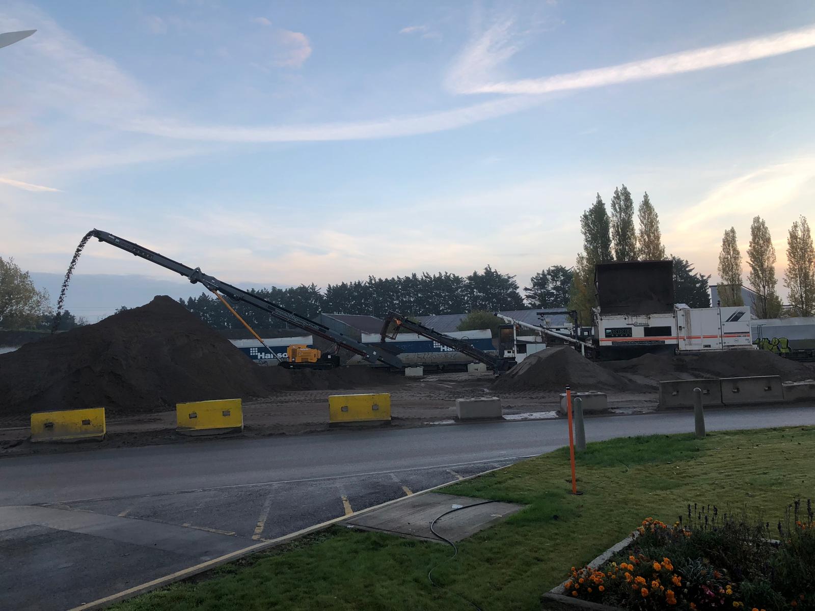 Our site set up of Wirtgen KMA 220 blending plant, stacking conveyor and front-end loading shovel were used by our operations team to blend the materials to have concrete sand ready for the next days production of concrete.