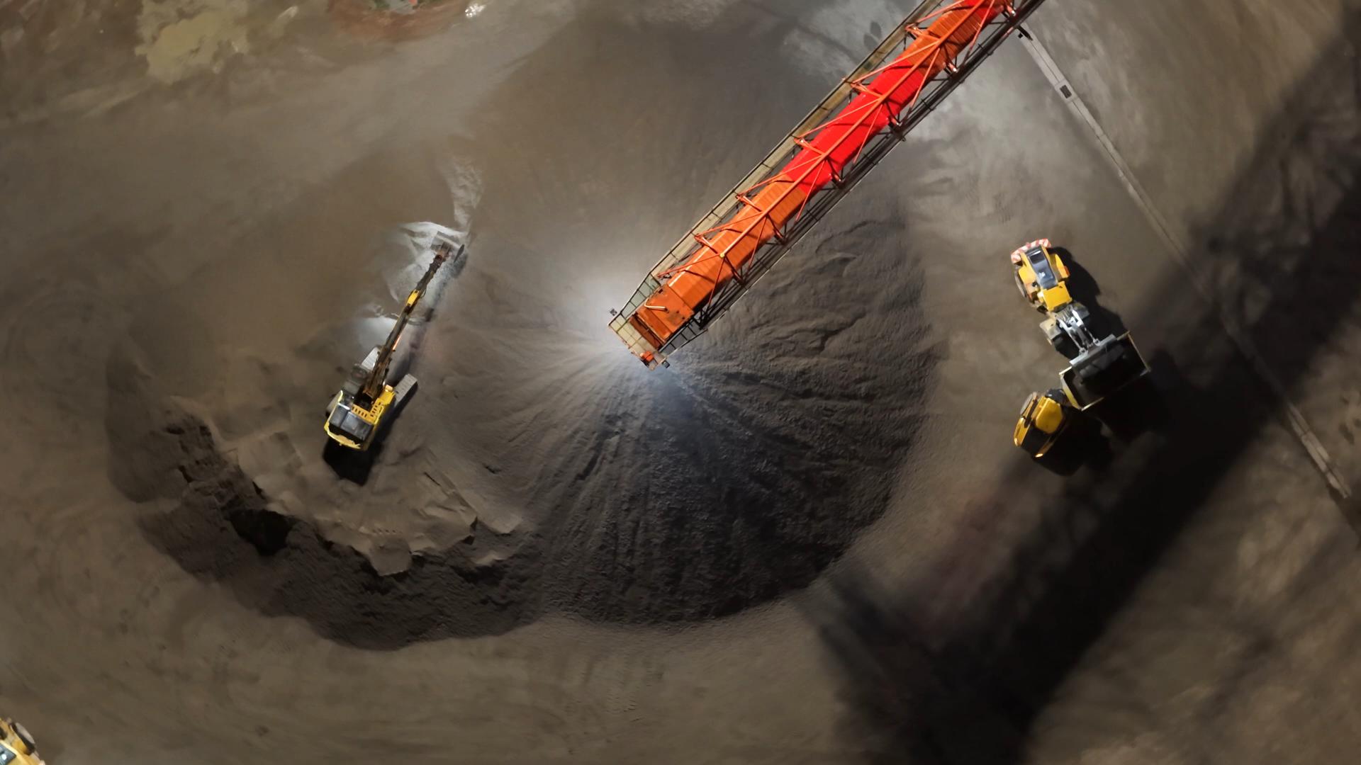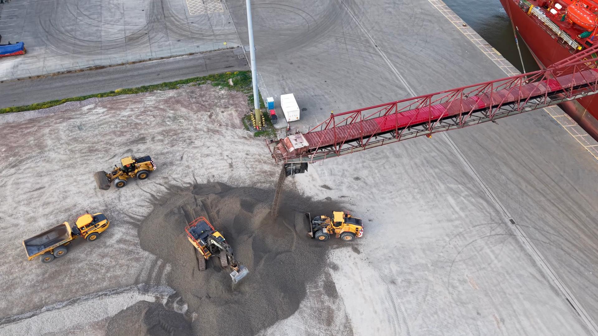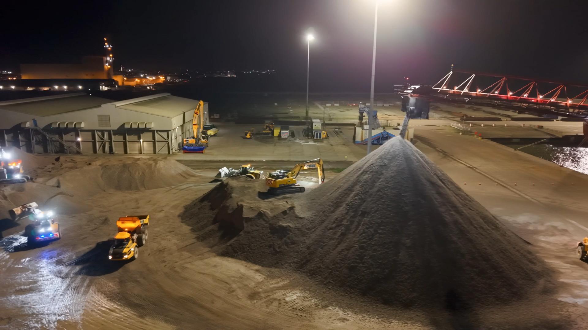 The consignments are discharged via the ships conveyor belt to a temporary stockpile at the quayside. Using front end loading shovels, excavators and dump trucks (ADTs) we relocate the material to Holcim’s on-port facility. Stockpiles are managed using the loading shovels and excavators to stock material to the maximum height allowed to minimise the storage footprint.
